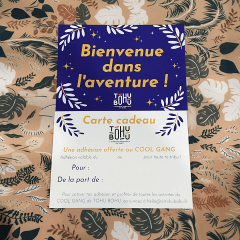 CARTE CADEAU Envie d'offrir un cadeau 100% parent-friendly et 100% utile ? Exit la quinzième peluche et bonjour l'adhésion au COOL GANG de TOHU BOHU ! C'est LA bonne idée cadeau pour chouchouter des copains-copines qui ont ou vont avoir des enfants. Pourquoi c'est THE super cadeau ? >le COOL GANG c'est une vraie communauté de parents ! Ressources, entraides, soutien en cas de coup de mou... c'est l'idéal pour ne pas se sentir seul.e dans cette folle aventure parentale ! >tu offres des moments à partager en famille : cirque, arts plastique, musique, sortie en nature... on propose 2 à 3 activités par mois et c'est toujours de jolis instants plein d'émotions qu'on oublie pas ! >c'est un choix ethique qui sort des logiques de la course folle à la consommation, tu n'aimes pas acheter pour acheter le truc qui va rester encombrer un placard, là tu es sur.e que ça sera utile aux parents et que ça fera kiffer les loustics. Comment ça marche ? >Tu achètes la carte cadeau à 50€ et on te l'envoie par La Poste et/ou par Mail >Elle est valable pour tous les membres de la tribu à qui tu l'offres et donne accès à l'ensemble de notre calendrier d'activités du 1er septembre au 31 août de l'année en cours >La personne à qui tu l'offres n'aura plus qu'à nous faire signe par mail au moment d'activer sa carte et de rejoindre le COOL GANG